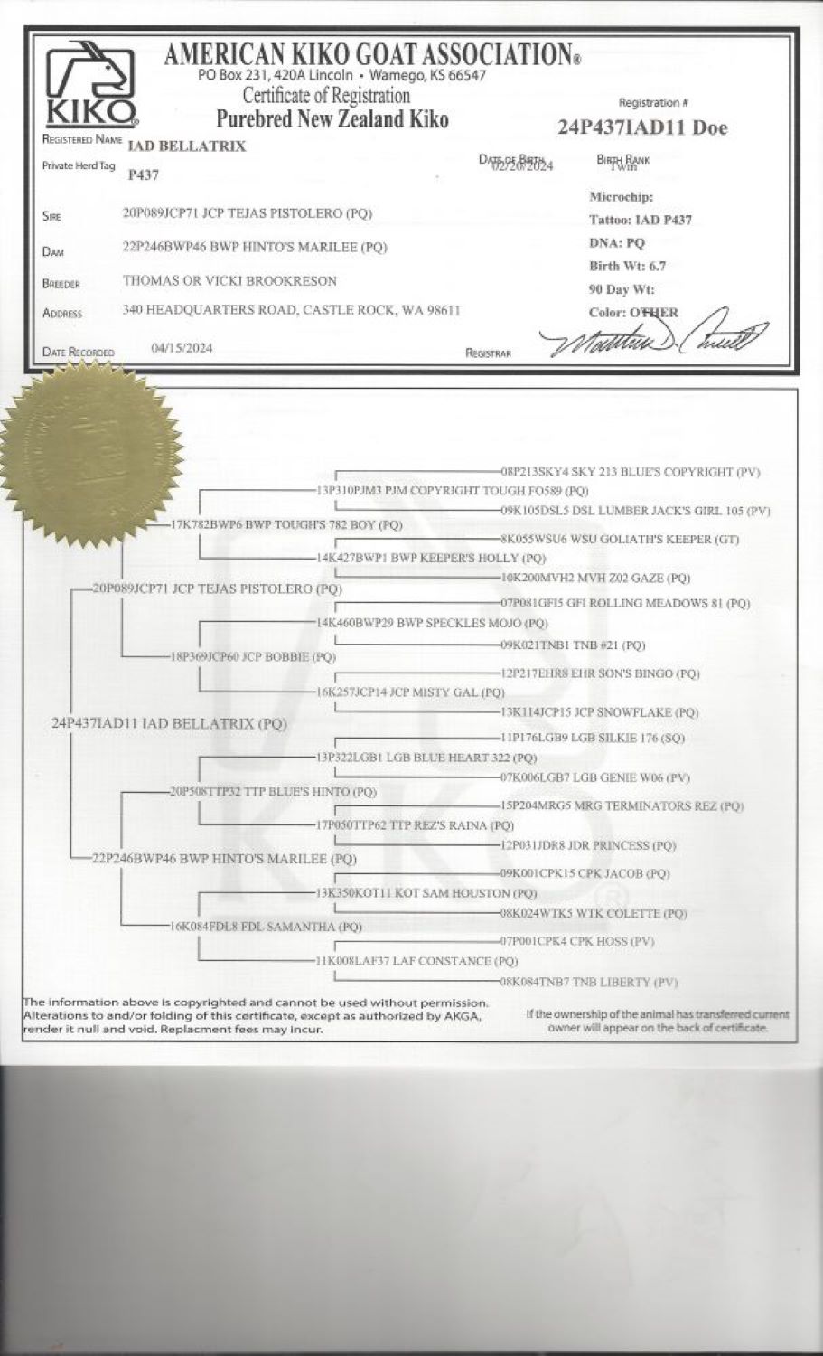 IAD Bellatrix 100% NZ ancestry DNA Verified AKGA & NKR reg Kidded 2/20/2024 |