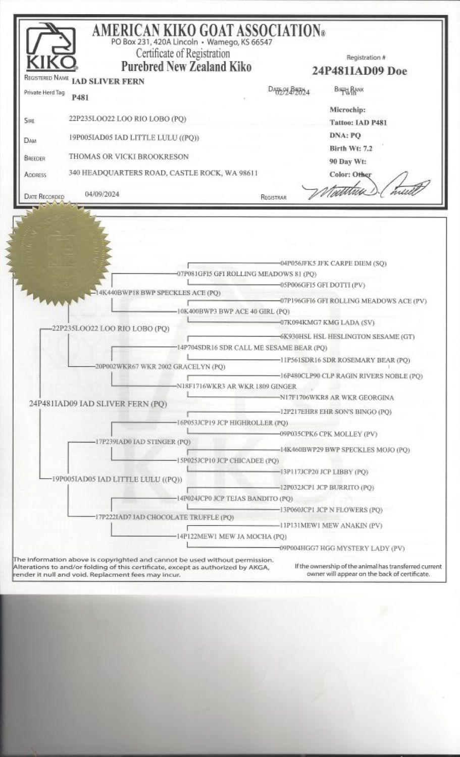 IAD Silver Fern 100% NZ ancestry DNA Verified AKGA & NKR reg Kidded 2/24/2024 |
