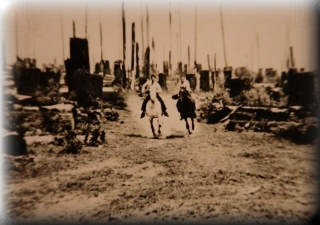 Frank and Verdi Buker Racing Down a Logging Road in a clearcut. Frank on the grey and Verdi on the bay horse. |